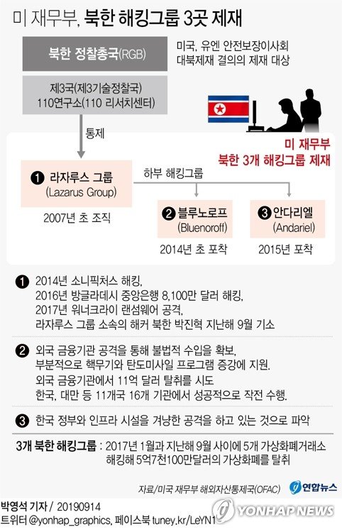 ¿ö³ÊÅ©¶óÀÌ ·£¼¶¿þ¾î¡¤¼Ò´ÏÇÈó½º ÇØÅ·¡¤2016³â ùÛ±¹¹æºÎ ÇØÅ· µî ´ë°Å °Å·Ð ºÏ¹ÌÇù»ó Àç°³ Àü¸Á ¼Ó ¾Ð¹Ú¼º Çຸ¡¦¾÷°è¡¤¾ð·Ð ÀοëÇÑ ÇÇÇØÁ¦½Ã·Î ¼öÀ§Á¶Àýµµ (¿ö½ÌÅÏ=¿¬ÇÕ´º½º) ¹é³ª¸® ƯÆÄ¿ø = ¹Ì±¹ À繫ºÎ´Â 13ÀÏ(ÇöÁö½Ã°£) ºÏÇÑÀÇ 3°³ ÇØÅ·±×·ìÀ» Á¦Àç ¸®½ºÆ®¿¡ ¿Ã·È´Ù. 9¿ù Çϼø ¹Ì±¹°ú Çù»óÇÒ ¿ëÀǰ¡ ÀÖ´Ù¸ç '»õ °è»ê¹ý'À» ¿ä±¸ÇÏ´Â ºÏÇÑ¿¡ µµ³Îµå Æ®·³ÇÁ ´ëÅë·ÉÀÌ À¯È ¹ß¾ðÀ¸·Î È´äÇÏ´Â °¡¿îµ¥ À繫ºÎ Â÷¿ø¿¡¼ '´ëºÏ¾Ð¹Ú °è¼Ó' ¸Þ½ÃÁö¸¦ º¸³½ °ÍÀ¸·Î º¸¿© ºÏ¹Ì ½Ç¹«Çù»ó Àç°³¿¡ ¿µÇâÀ» ÁÖ°Ô µÉÁö ÁÖ¸ñµÈ´Ù. ¹Ì±¹ À繫ºÎ ÇØ¿ÜÀÚ»êÅëÁ¦±¹(OFAC)Àº À̳¯ ȨÆäÀÌÁö¸¦ ÅëÇØ º¸¾È¾÷°è¿¡¼ '¶óÀڷ罺 ±×·ì', 'ºí·ç³ë·ÎÇÁ', '¾È´Ù¸®¿¤'·Î ÄªÇØ¿Â ºÏÇÑÀÇ 3°³ ÇØÅ·±×·ìÀ» Á¦ÀçÇÑ´Ù°í ¹àÇû´Ù. OFAC´Â "À̵éÀº ¹Ì±¹°ú À¯¿£ÀÇ Á¦Àç´ë»óÀÌÀÚ ºÏÇÑÀÇ Áß¿ä Á¤º¸´ç±¹ÀÎ Á¤ÂûÃѱ¹ÀÇ ÅëÁ¦¸¦ ¹Þ°í ÀÖ´Ù"¸é¼ °¢ ±×·ì¿¡ ´ëÇÑ ¼³¸íÀ» ÷ºÎÇß´Ù. OFAC¿¡ µû¸£¸é ¶óÀڷ罺 ±×·ìÀº 2007³â²² ºÏÇÑÀÇ °øÀÛ¾÷¹«¸¦ ÃѰýÇÏ´Â Á¤ÂûÃѱ¹ÀÇ 3±¹ 110¿¬±¸¼Ò »êÇÏ·Î ¸¸µé¾îÁ³À¸¸ç Áß¿äÇÑ ÀÎÇÁ¶ó ½Ã¼³À» ºñ·ÔÇØ °¢±¹ Á¤ºÎ¿Í ±º, ±ÝÀ¶, Á¦Á¶¾÷, ÃâÆÇ, ¾ð·Ð, ¿£ÅÍÅ×ÀÎ¸ÕÆ® ºÐ¾ß µîÀ» °Ü³ÉÇϰí ÀÖ´Ù. ¶óÀڷ罺 ±×·ìÀº 150¿©°³±¹¿¡ ¿µÇâÀ» ÁÖ°í 30¸¸´ëÀÇ ÄÄÇ»ÅÍ¿¡ ÇÇÇØ¸¦ ÁØ 2017³â ¿ö³ÊÅ©¶óÀÌ ·£¼¶¿þ¾î »ç°Ç¿¡ °ü¿©ÇßÀ¸¸ç 2014³â ¹Ì±¹ ±â¾÷ ¼Ò´ÏÇÈó½º ¿£ÅÍÅ×ÀÎ¸ÕÆ® ÇØÅ· »ç°Ç¿¡µµ Á÷Á¢Àû Ã¥ÀÓÀÌ ÀÖ´Ù. ºí·ç³ë·ÎÇÁ´Â ±¹Á¦»çȸÀÇ ´ëºÏÁ¦Àç °È ´ëÀÀÀ» À§ÇØ 2014³â²² ¸¸µé¾îÁ³´Ù. ¿Ü±¹ ±ÝÀ¶±â°ü °ø°ÝÀ» ÅëÇØ ºÒ¹ýÀû ¼öÀÔÀ» È®º¸Çϴµ¥, ºÎºÐÀûÀ¸·Î ÇÙ¹«±â¿Í źµµ¹Ì»çÀÏ ÇÁ·Î±×·¥ Áõ°À» À§ÇÑ °ÍÀ̶ó°í OFAC´Â ÁöÀûÇß´Ù. OFACÀº ¾÷°è Á¶»ç ¹× ¾ð·Ðº¸µµ¸¦ Àοë, ºí·ç³ë·ÎÇÁ°¡ ¿Ü±¹ ±ÝÀ¶±â°ü¿¡¼ 11¾ï ´Þ·¯ Å»Ã븦 ½ÃµµÇß°í ¹æ±Û¶óµ¥½Ã¿Í Àεµ, ¸ß½ÃÄÚ, ÆÄŰ½ºÅº, Çʸ®ÇÉ, Çѱ¹, ´ë¸¸ µî 11°³±¹ 16°³ ±â°ü¿¡¼ ¼º°øÀûÀ¸·Î ÀÛÀüÀ» ¼öÇàÇß´Ù°í ÀüÇß´Ù. ¹æ±Û¶óµ¥½Ã Áß¾ÓÀºÇà °èÁ¿¡¼ 8õ¸¸ ´Þ·¯¸¦ »©°£ »ç°Ç°ú ±¹Á¦ÀºÇà°£Åë½ÅÇùȸ(SWIFT) ½Ã½ºÅÛ¿¡¼ 8¾ï5õ100¸¸ ´Þ·¯¸¦ »©³»·Á ÇÑ »ç°Ç¿¡µµ ºí·ç³ë·ÎÇÁ¿Í ¶óÀڷ罺 ±×·ìÀÌ Çù·ÂÇß´Ù°í OFACÀº ¼³¸íÇß´Ù. ¸¶Áö¸·À¸·Î ¾È´Ù¸®¿¤ÀÇ °æ¿ì 2015³â²²ºÎÅÍ È°µ¿ÀÌ Æ÷ÂøµÆÀ¸¸ç Çѱ¹ Á¤ºÎ¿Í ÀÎÇÁ¶ó ½Ã¼³À» °Ü³ÉÇÑ °ø°ÝÀ» Çϰí ÀÖ´Â °ÍÀ¸·Î ÆÄ¾ÇµÆ´Ù. 2016³â 9¿ù Çѱ¹ ±¹¹æÀå°üÀÇ °³ÀÎ ÄÄÇ»ÅÍ¿Í ±¹¹æºÎ ÀÎÆ®¶ó³Ý¿¡ ħÅõÇØ ±º»çÀÛÀü Á¤º¸¸¦ »©³»·ÁÇÑ °ÍÀÌ ´ëÇ¥ÀûÀ¸·Î, Çѱ¹ Á¤ºÎ Àλç¿Í Çѱ¹±º¿¡ ´ëÇÑ ¾Ç¼º »çÀ̹ö Ȱµ¿À» °è¼ÓÇϰí ÀÖ´Ù´Â °Ô ¾÷°èÀÇ Æò°¡¶ó°í OFACÀº ÀüÇß´Ù. ¿Ü±¹ Á¤ºÎ³ª ±ÝÀ¶±â°ü, ÀÎÇÁ¶ó ½Ã¼³ µî¿¡ ´ëÇÑ ÀüÅëÀû »çÀ̹ö °ø°Ý À̿ܿ¡ ºÏÇÑÀº °¡»óÈÆó³ª ¾ÏÈ£ÈÆó ÂÊ¿¡µµ ¼ÕÀ» ´ë 2017³â 1¿ùºÎÅÍ 2018³â 9¿ù »çÀÌ ¾Æ½Ã¾ÆÀÇ 5°³ ¾ÏÈ£ÈÆó°Å·¡¼Ò¿¡¼¸¸ 5¾ï7õ100¸¸ ´Þ·¯¸¦ »©³ÂÀ» °ÍÀ¸·Î ÃßÁ¤µÇ¸ç ¿ª½Ã ´ë·®»ì»ó¹«±â(WMD)¿Í źµµ¹Ì»çÀÏ ÇÁ·Î±×·¥ Áö¿øÀ» À§ÇÑ °ÍÀÏ ¼ö ÀÖ´Ù°í OFACÀº ¼³¸íÇß´Ù. ½Ã°É ¸Çµ¨Ä¿ ¹Ì À繫ºÎ Å×·¯¡¤±ÝÀ¶Á¤º¸ ´ã´ç Â÷°üÀº "À繫ºÎ´Â ºÒ¹ý ¹«±â¡¤¹Ì»çÀÏ ÇÁ·Î±×·¥ Áö¿øÀ» À§ÇØ »çÀ̹ö °ø°ÝÀ» ÀÚÇàÇØ¿Â ºÏÇÑ ÇØÅ·±×·ìµé¿¡ Á¶Ä¡¸¦ ÃëÇÑ´Ù"¸é¼ "¿ì¸®´Â ¹Ì±¹°ú À¯¿£ÀÇ ±âÁ¸ ´ëºÏÁ¦À縦 °è¼Ó ÀÌÇàÇÒ °ÍÀÌ¸ç ±ÝÀ¶ ³×Æ®¿öÅ© »çÀ̹öº¸¾È °³¼±À» À§ÇÏ ±¹Á¦»çȸ¿Í °è¼Ó Çù·ÂÇÒ °Í"À̶ó°í Çß´Ù. À̳¯ Á¦Àç·Î ÀÌµé ±×·ìÀÇ ¹Ì±¹ ³» ÀÚ»êÀº µ¿°áµÇ¸ç ¹Ì±¹¹ÎÀÌ À̵é°ú °Å·¡ÇÏ´Â ÇàÀ§µµ ±ÝÁöµÈ´Ù. OFACÀº À̳¯ Á¦À縦 ¹ßÇ¥ÇÏ¸é¼ ºÏÇÑÀÇ »çÀ̹ö °ø°Ý¿¡ µû¸¥ ÇÇÇØ ³»¿ªÀ» ÀÚü Áý°è·Î Á¦½ÃÇÏ´Â ´ë½Å '¾÷°è¿Í ¾ð·Ðº¸µµ¿¡ µû¸£¸é'À̶ó´Â Ç¥ÇöÀ» ¿©·¯ Â÷·Ê ½è´Ù. ´ëºÏ¾Ð¹Ú ±âÁ¶¿¡ µû¶ó Á¦À縦 ¹ßÇ¥Çϸ鼵µ ºÏÇÑ¿¡ ´ëÇÑ ÀÚ±ØÀ» ÁÙÀÌ¸ç ¼öÀ§¸¦ Á¶ÀýÇÏ·Á ÇÑ °ÍÀÌ ¾Æ´Ï³Ä´Â ºÐ¼®ÀÌ ³ª¿Â´Ù. ±×·¯³ª ºÏÇÑÀÌ 9¿ù Çϼø ¹Ì±¹°ú Çù»óÇÒ ¿ëÀǰ¡ ÀÖ´Ù¸ç '»õ °è»ê¹ý'À» ¾Ð¹ÚÇÏ´Â ½ÃÁ¡¿¡ ±×°£ ÀÌ·ïÁø ºÏÇÑÀÇ »çÀ̹ö °ø°ÝÀ» ¹®Á¦ »ï´Â À̹ø Á¦Àç°¡ ¹ßÇ¥µÇ¸é¼ ºÏ¹Ì ½Ç¹«Çù»ó Àç°³¿¡ ¿©ÆÄ°¡ ÀÖÀ» ¼ö ÀÖ´Ù´Â °üÃøµµ Á¦±âµÈ´Ù. ¹Ì Á¤ºÎ´Â ÀÛ³â 9¿ù ¶óÀڷ罺 ±×·ì ¸â¹öÀÎ ºÏÇÑ ±¹ÀûÀÇ ¹ÚÁøÇõÀ» ±â¼ÒÇÏ°í ¹ÚÁøÇõ°ú ¼Ò¼Ó ȸ»ç 'Á¶¼± ¿¢½ºÆ÷'¸¦ Á¦Àç ¸í´Ü¿¡ ¿Ã¸° ¹Ù ÀÖ´Ù. ºÏÇÑÀÇ »çÀ̹ö°ø°Ý Ȱµ¿¿¡ ´ë